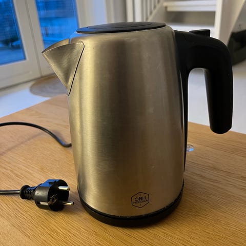 OBH Nordica elkedel i rustfrit stål med sort håndtag.