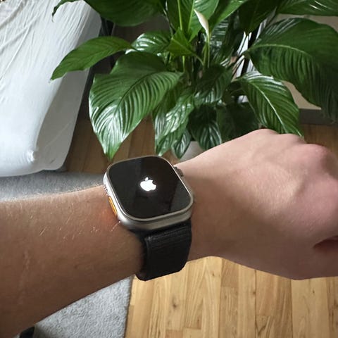 Næsten nyt Apple Watch Ultra 3 Titanium med ekstra gummirem.