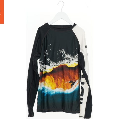 Langærmet UV-bluse med sort ærmer og ryg. Forsiden har et farverigt print af et skateboardmiljø med solnedgang i baggrunden. Blusen er designet til beskyttelse mod solens stråler.