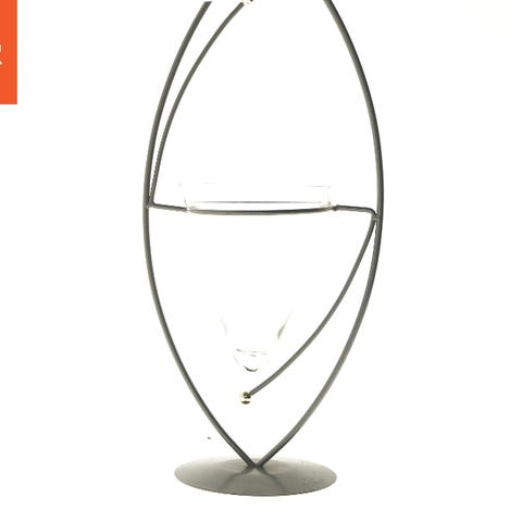 Vasen er lavet af klart glas og holdes af et stilfuldt metalstativ. Stativet har en oval form og står på en rund base. Vasen passer til blomsterdekorationer og minimalistisk indretning. Det samlede mål af objektet er 66 cm i højden.