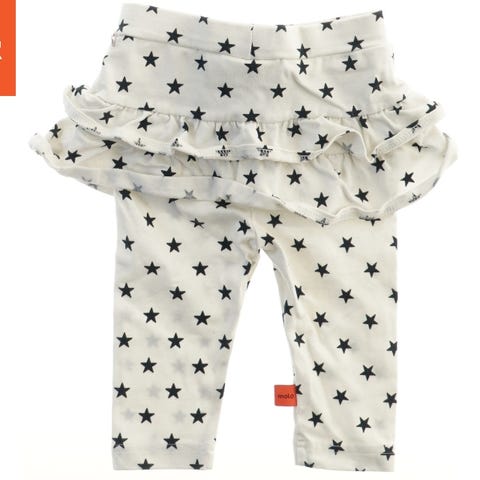 Bukserne har et gråt mønster med stropper ved anklerne. Der er stjerneformede detaljer på bagbenene og elastik i taljen for bedre pasform.