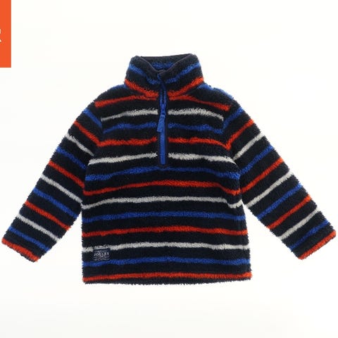 En blød, strikket trøje med lange ærmer og en halv lynlås foran. Trøjen har et stribet mønster i farverne sort, rød, blå og hvid, og er lavet af et fluffy materiale. Der er et lille mærke nederst foran, der viser brandnavnet Joules.