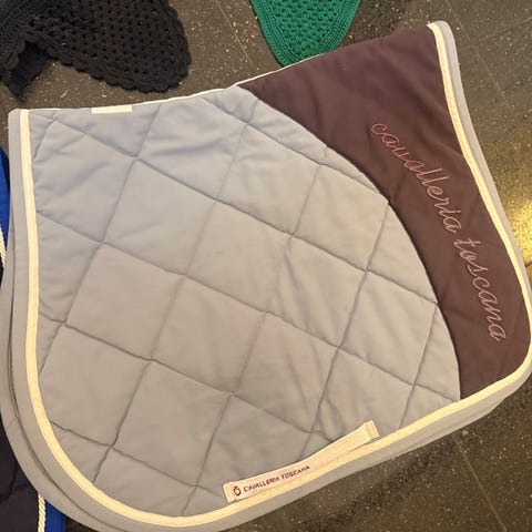 Cavalleria Toscana underlag i beige med navy kant. Der er lidt sort efter sadlen