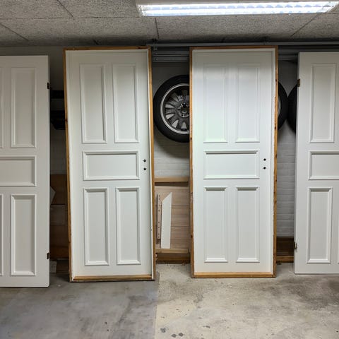 6x massive fyrretræsdøre inkl. karm, greb og lister