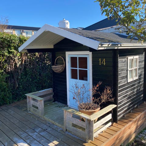 Hjemmelavet Udendørs legehus i træ med trekantet form og klatrevæg med farvede greb. Legehuset har åbning foran og et vindue i siden. Velegnet til børn til udendørs leg og fysisk aktivitet. Står i Nygaard