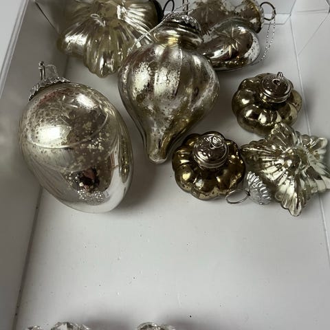 Sølv og glas juledekorationer (str. Ø 10 og 10 cm og 19 cm)
