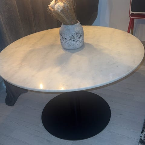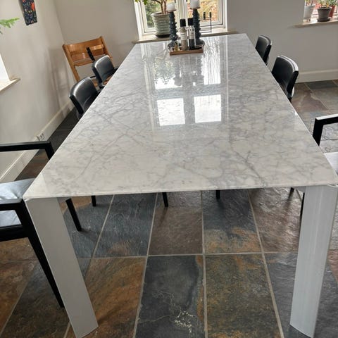 Marcel Wanders Artemide spisebord med bordplade i marmor. Bordet har et rektangulært design med en hvid og grå marmoreret overflade. Egnet til spiseområde eller mødelokale.
