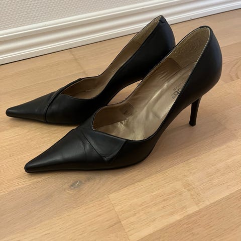 Et par sorte sko med høj hæl, størrelse 39. Skoene har en spids tå og en klassisk silhuet. Materialet fremstår som en form for stof eller ruskind. Hælhøjden er anslået til at være omkring 7-10 cm. Skoene har nogle tegn på brug, især ved hælen og sålen.