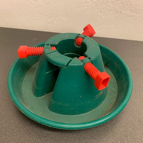 Denne genstand er en juletræsfod med en diameter på 31 cm. Foden er lavet af plast og har en grøn farve. Den har en central cylinder, hvor træet kan placeres, og tre metal skruer til at fastgøre og stabilisere træet. Foden kan holde vand, hvilket hjælper med at holde juletræet friskt længere.