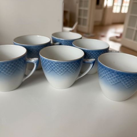 Porcelæns kaffekop med tilhørende underkop. Begge dele har et blåt mønster, der ligner fiskeskæl med en måge afbildet på koppen. På undersiden af både kop og underkop ses 'B&G Copenhagen Porcelain Made in Denmark' mærket. Størrelsen er 6,5x9,5 cm for koppen og en diameter på 14 cm for underkoppen.