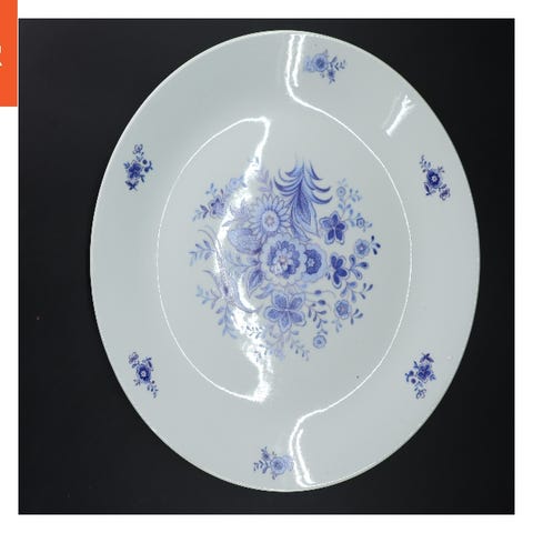 Porcelænsfad fra Gustavberg i serien Blå Blom, med dimensionerne 22x18 cm. Fadet har en oval form og en scalloped kant, der tilføjer en elegant touch. Rundt om kanten er der små blå mønstre, som giver fadet et charmerende og klassisk udseende. Bagsiden af fadet er ensfarvet uden mønster.