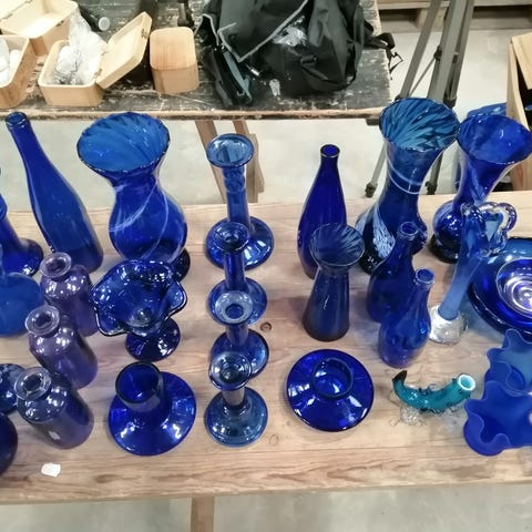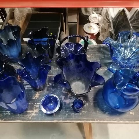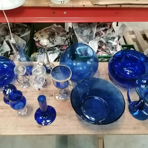 Blå glas, en samling af forskellige vaser, glas, skåle og lysestager.