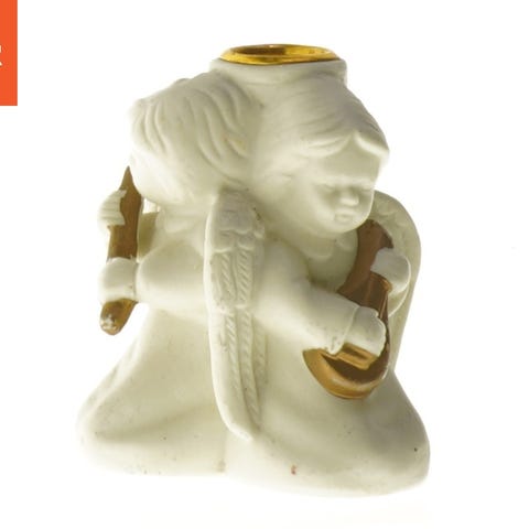 En lille keramikfigur formet som en engel, der fungerer som en lysestage. Den er hvid og har et enkelt design med en plads til et lille lys foran. Dimensionerne af figuren er cirka 11,5 cm. Bunden af figuren er belagt med grøn filt for at beskytte overflader mod ridser. Den glatte keramiske overflade giver et elegant udseende.