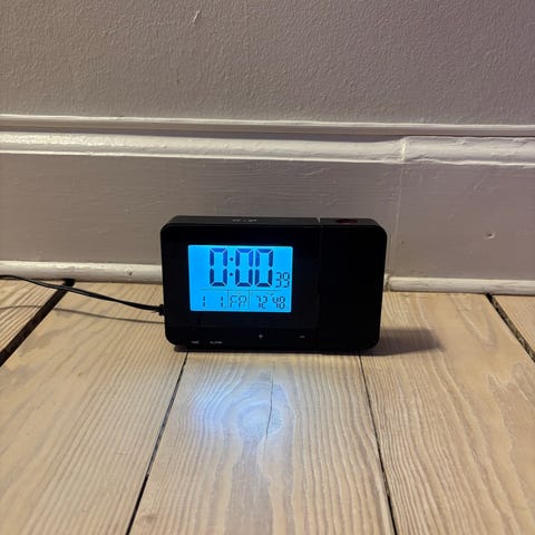 Dette er et Philips elektronik vækkeur med digitale funktioner. Det kommer med en tilslutningskabel og har en kompakt størrelse på 18,5x9,5x7 cm. Vækkeuret har en skærm og knapper til indstilling af alarmsensorer. Der er også en adapter til strømtilslutning.