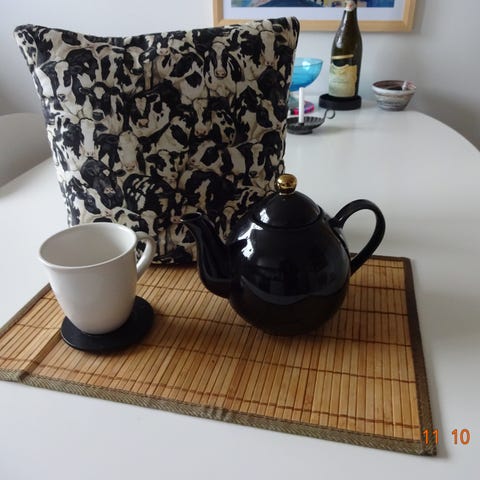 En stor tekande med en kapacitet på ca. 30 cm, fremstillet i glaseret keramik. Tekanden er sort og har en rund form med et stort håndtag og en tud til hældning. Den leveres med et tilhørende låg med en lille topknop. Kanden er ideel til servering af te til flere personer og er både funktionel og dekorativ.