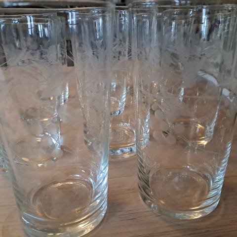 Glas, 4 stk. Fra Holmegaard af mærket Stella. Utrolig smukke drikkeglas med slebet druemotiv. H: 10,5 cm. 4 stk for kun 125 kr. Se pgså, hvad jeg ellers har til salg.