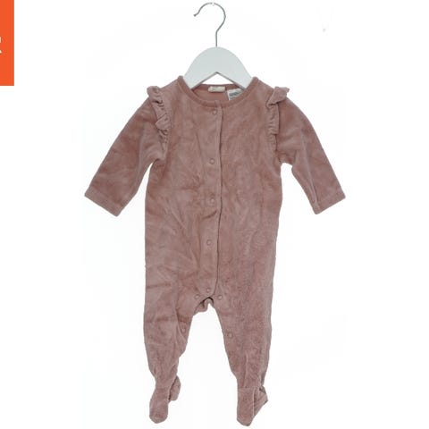 Babysparkedragt i gråt stof med lyse stjernemønster. Dragten har lange ærmer og ben og er udstyret med knaplukning, der strækker sig fra halsen og ned langs siden foran. Materialet ser blødt og komfortabelt ud, egnet til babyer. Designet har ribkant ved manchetter og ankler, der giver en tæt pasform. Størrelse 62, passende til små børn.