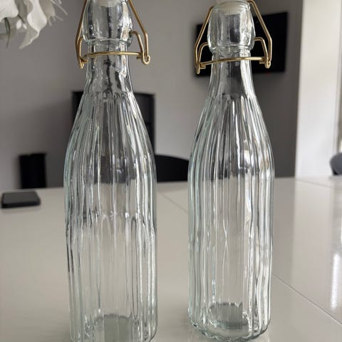 Carlsberg og Neptun. Gamle sodavandsflasker med patentprop. Flaskerne er lavet af klart glas og har en keramisk patentprop med metalbeslag. De er velegnede til opbevaring af væsker og har et klassisk design med påskriften Neptun og Carlsberg.
