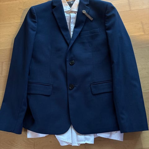 Blazer, vest, bukser, hvid skjorte og butterfly.