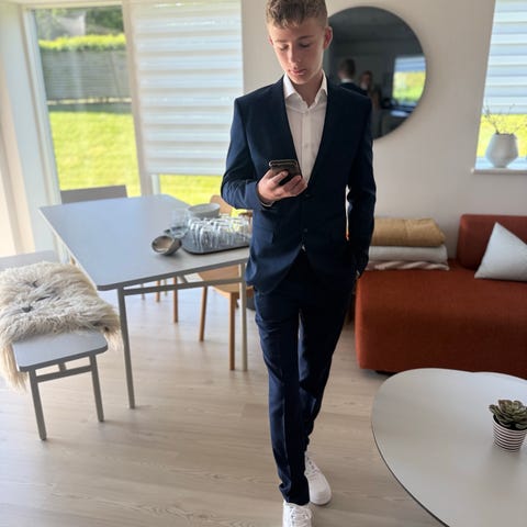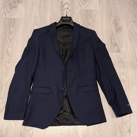 Jakkesæt fra Jack and Jones. Lækker mørk blå farve. Brugt 1 gang (konfirmation). Det er til den meget slanke og høje krop. Det skal nok en tur til rens, da det har hængt og samlet støv.