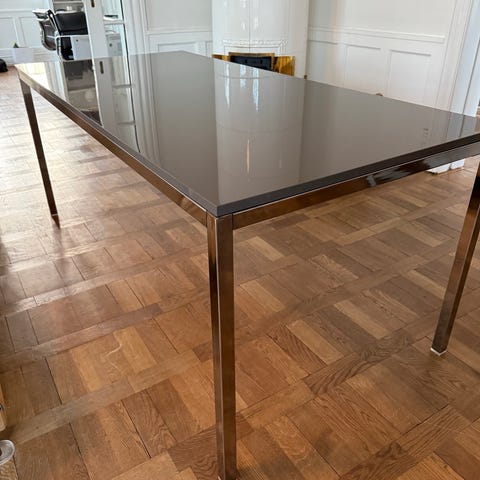 Bord - underdel af stål og bordplade er grå (blank plastik). Vi har brugt bordet som skrivebord, men det er egentlig et spisebord.
