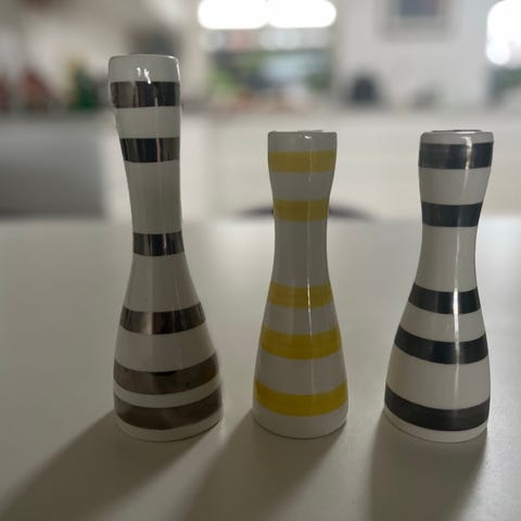 8 Kähler Omaggio lysestager i keramik med håndmalede striber i rød og granitgrå.