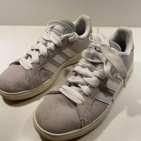 Adidas børnesko til unisex i størrelse 34. Skoene har en hvid farve med sorte striber og er designet til børn.