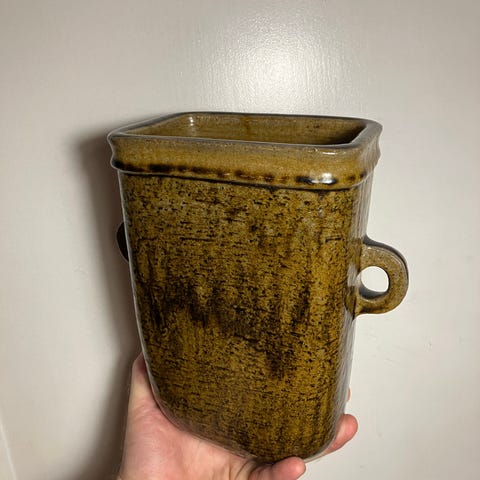 Vase fra Kähler formgivet og signeret af Nils Kähler. Mål: cirka 16 cm høj, 22,5 cm bred. Fremstår hel og intakt. Den har dog en lidt underlig “klang”, når der bliver banket (blidt!) på den. Vil derfor anbefale den til dekorativt brug, ikke som brugsgenstand.