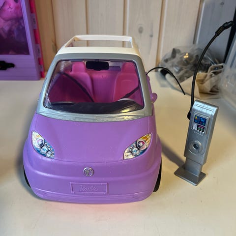 Barbie bil/legetøjsbil i lilla farve. Legetøjsbilen er designet til børn og har detaljer som åbne sider og hjul, der kan rulle. Egnet til rolleleg og kreativ leg.
