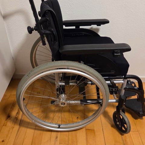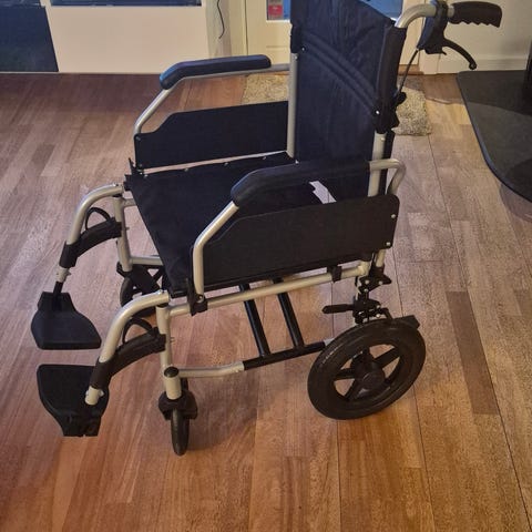 Standard kørestol med sorte hjul og blå stel. Kørestolen er designet til at give mobilitetshjælp og har aftagelige hjul for nem transport og opbevaring.