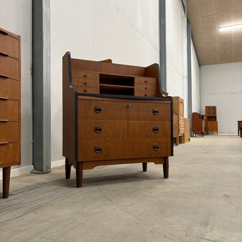 Teaktræ chatol med 3 store og 3 små skuffer samt udtræks skriveplade