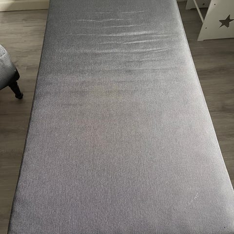 Jysk seng med madras i sort farve.