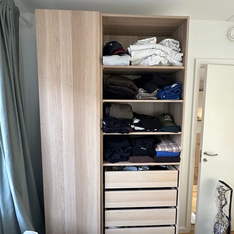 Vi har valgt at sætte et gardin op i stedet for skabslågerne pga. pladsen i værelset, så der er boret en skinne op i toppen af skabet - men denne kan nemt tages af igen, hvis man hellere ønsker lågerne på. Både låger og gardin følger med.