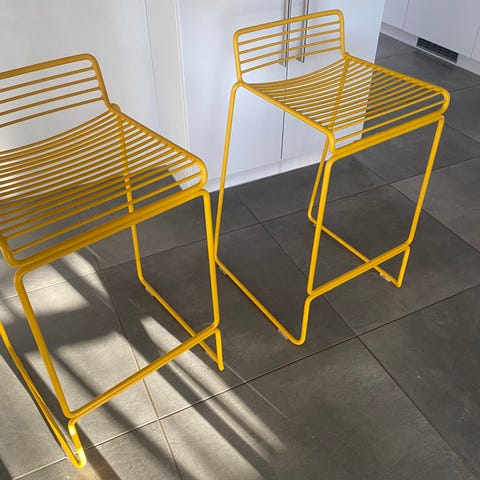Sælger 4 originale HAY barstole i gul pulverlakeret metal. Stolene har et let og moderne tråddesign, som passer perfekt til både køkkenø, barbord, café, altan eller terrasse.