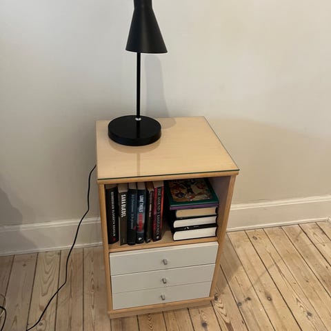 2 sengeborde sælges samlet. Meget holdbare og stabile, i mørkegråt stof. Har en stor skuffe i bunden med smalt metalhåndtag, og en lyskontakt i sort plastik med metal ramme. Ledning på bagsiden 120cm lang. Lyset kommer fra hele toppen, der er af glas og fremstår grå når lyset er slukket.