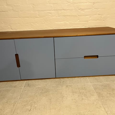 Pæn og velholdt kommode med 4 skuffer og 1 låge. Er monteret på ben i børstet stål.