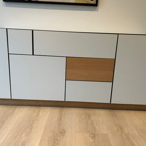 Bolia Claus Bonderup sekretær i lyst træ. Møblet har en klaplåge, en skuffe og opbevaringsrum med låger. Designet af Claus Bonderup og fremstillet af Bolia.
