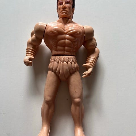 Vintage sæt med to actionfigurer bestående af en skeletfigur i hvid plastik og en muskuløs mand med grøn top, blå bukser og sort gummi-sko. Figurens originale beklædning følger med (det er dog temmelig slidt). Fra start 80´erne. Desuden 2 vintage wrestling figurer med "ROOS" bælter der åbentbart er lavet til at klemme sig fast på en blyant eller lignende.
