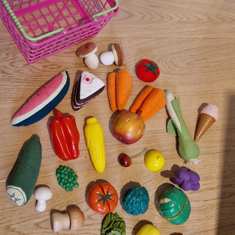 Stor Indkøbskurv med frugt, grønt, dressinger og dåser.