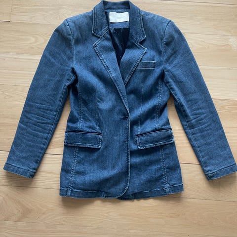 Copenhagen Muse Andre jakker til kvinder i størrelse M. Jakken er blå og fremstillet af bomuld. Den har et quiltet mønster og et bælte til at justere pasformen. Ærmerne kan lynes af , så den kan bruges som vest også. Længde midt bagpå: 114 cm