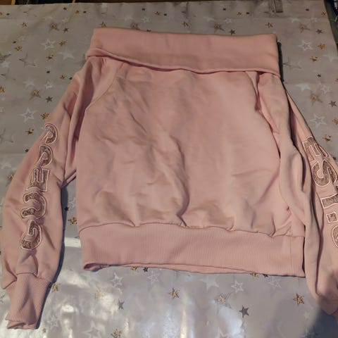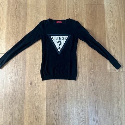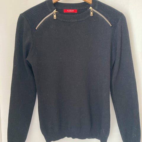 GUESS sweater i beige farve, størrelse M til kvinder. Fremstillet i polyester og akryl. Sweateren har en strikket struktur og V-udskæring. Brugt med uden spor.
