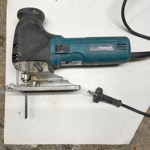 Makita 4350FCT stiksav med en effekt på 710 watt. Værktøjet leveres med opbevaringskasse og har ledning for strømforsyning. Egnet til forskellige saveopgaver med fokus på præcision og effektivitet.