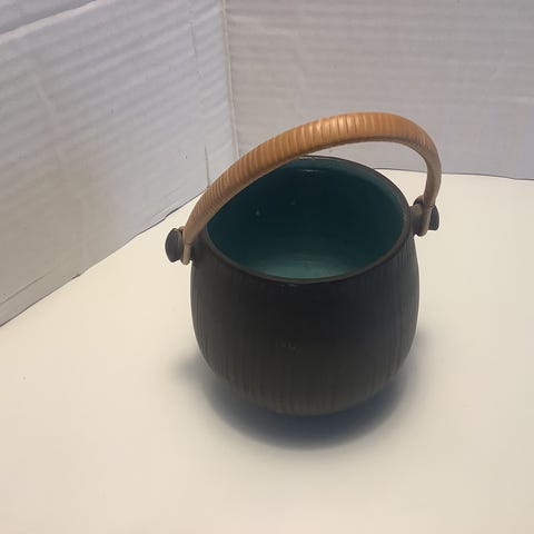 Smuk keramikskål / krukke med hank i flet med mat kulfarvet /mørk varmgrå glasur udenpå og blank aqua / seafoam glasur inden i. Produceret af Hegnetslund Keramik i Danmark i 1960'erne.