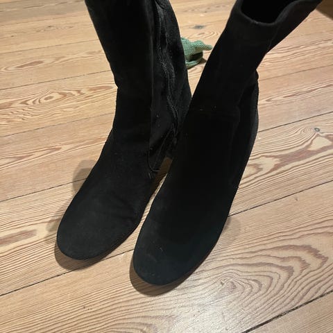 Bianco støvler i størrelse 38 lavet af sort ruskind og læder. Støvlerne har en høj hæl og en kombination af materialer, der giver et stilfuldt og robust udseende.