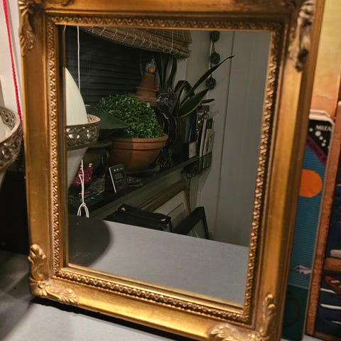 lille facet slebet spejl i en smuk guldramme, taler for sig selv, se billeder, mål 30 x 25 cm , Søgeord ! Indbo, indretning, pynt, dekoration, Deco, vintage, retro, SENDER KUN MED DAO ELLER AFHENTNING.