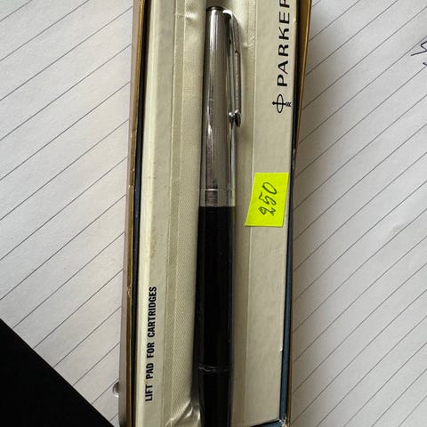 Parker Duofold fyldepen i sort med gulddetaljer. Pennen har en klassisk design og er egnet til skrivebrug. Samleobjekt måske fra 1940erne