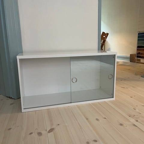 String Skab i teaktræ med skydelåger. Skabet har to skydelåger og hylder indvendigt til opbevaring. Møblet er udført i teaktræ og har et enkelt og funktionelt design.