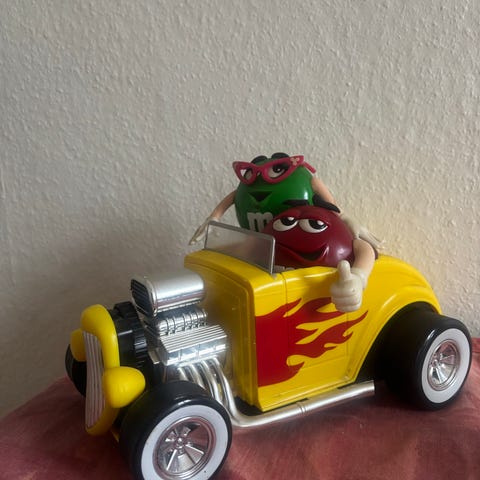 M&M's samlerbil med to figurer i rød og grøn farve. Bilen er gul med detaljer i krom og har flamme-dekorationer på siderne. Figurenes arme og ben er bevægelige, og bag på bilen er der en åbning, som kan bruges til opbevaring eller funktion som dele af legetøjet.samt en flyvemaskine