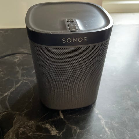 Sonos Play 1 højttaler i hvid farve. Kompakt trådløs højttaler med integreret strømforsyning. Designet til brug i forskellige rum og kompatibel med Sonos multirumssystem.