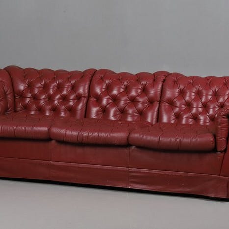 Sofaen har en klassisk Chesterfield-inspireret design med knapdetaljer og tre sædehynder. Materialet er læder, og sofaen er velegnet til opholdsstue eller loungeområde.